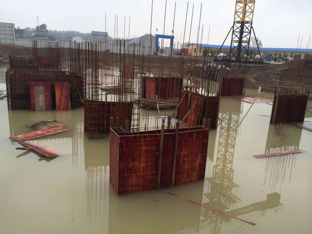 在松江花园一期,由于基坑积水严重,刚刚装好的桩基础模具已被雨水淹没,置业公司组织施工单位调集水泵,及时将基坑积水排出。