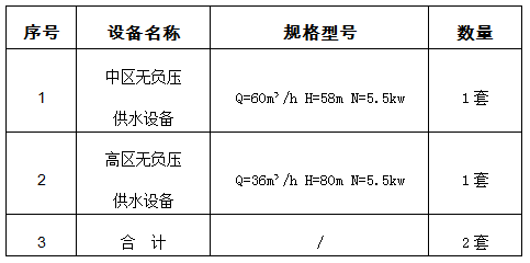 3、项目内容:金投•奥体庄园项目无负压供水设备(具体内容见下表)包括运输、调试、检验、培训以及售后服务等全部相关服务工作。