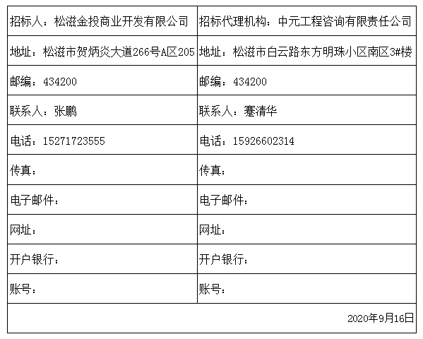 本招标项目松滋市金松新区集贸市场建设项目 (项目名称)已由松滋市发展和改革局 (项目审批、核准或备案机关名称)以2019-421087-52-03-061115 (批文名称及编号)批准建设,项目业主松滋金投商业开发有限公司,建设资金来自企业自筹 (资金来源),项目出资比例为100%,招标人为松滋金投商业开发有限公司,招标代理机构为中元工程咨询有限责任公司。项目已具备招标条件,现对该项目的施工进行公开招标。