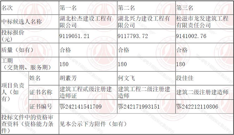 松滋市乡镇人才公寓建设项目松滋市乡镇人才公寓建设项目第二标段(八宝镇)于2022年07月15日在湖北省电子招投标交易平台发布招标公告,2022年08月09日在松滋市开标室(1)开标,并于2022年08月09日完成评标工作。根据评标委员会提交的评标报告,松滋金投商业开发有限公司已经确认评标结果,现进行评标结果公示。