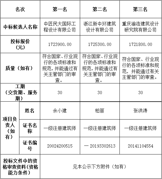 松滋市产城融合及配套基础建设项目初步设计松滋市产城融合及配套基础建设项目初步设计于2022年11月04日在湖北省电子招投标交易平台发布招标公告,2022年11月29日在松滋市开标室(2)开标,并于2022年11月29日完成评标工作。根据评标委员会提交的评标报告,湖北松滋金投置业有限公司已经确认评标结果,现进行评标结果公示。