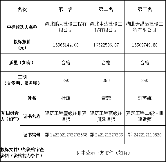金投•彩虹湾一期(S1号楼综合商业)及配套工程于2022年12月19日在湖北省电子招投标交易平台发布招标公告,2023年01月31日在松滋市开标室(1)开标,并于2023年01月31日完成评标工作。根据评标委员会提交的评标报告,湖北松滋金投置业有限公司已经确认评标结果,现进行评标结果公示。
