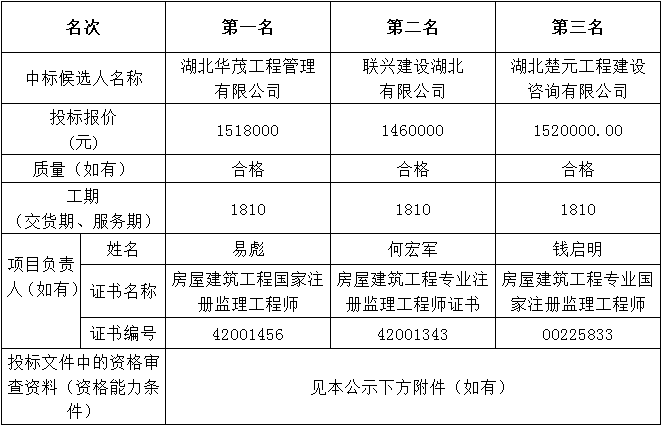金投•新城臻品建设项目监理金投•新城臻品建设项目监理于2023年02月28日在湖北省电子招投标交易平台发布招标公告,2023年03月30日在松滋市开标室(1)开标,并于2023年03月30日完成评标工作。根据评标委员会提交的评标报告,湖北松滋金投置业有限公司已经确认评标结果,现进行评标结果公示。