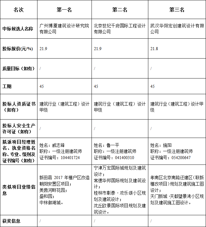 松滋市金投•划子嘴幸福家园安置小区及配套设施建设项目设计于2018年11月24日在湖北公共资源交易信息网发布招标公告,2018年12月24日在松滋市公共资源交易中心开标。根据评标委员会提交的报告,松滋市金投•划子嘴幸福家园安置小区及配套设施建设项目设计已经确认开标结果,现进行中标候选人公示。