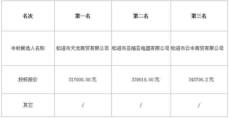 松滋市便民服务中心食堂通风及空调设备安装与采购项目于2019年8月1日发布询价邀请函,2019年8月1日在sunbet申愽官网开评标室开标。根据评标小组提交的评标结论,sunbet申愽官网已经确认开标结果,现进行中标候选人公示。