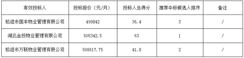 金投•新城壹品前期物业服务项目于2019年08月03日在松滋新闻网(网址:http://www.songzinews.net)(媒介名称)上发布招标公告,2019年09月12日在松滋市乐乡凯瑞大酒店五楼会议室开标,并于2019年09月12日完成评标工作。根据评标委员会提交的评标报告,湖北松滋金投置业有限公司已经确认评标结果,现进行评标结果公示。