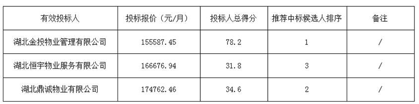 金投•奥体庄园前期物业服务项目于2019年08月04日在松滋新闻网(网址:http://www.songzinews.net)(媒介名称)上发布招标公告,2019年09月10日在松滋市乐乡凯瑞大酒店五楼会议室开标,并于2019年09月10日完成评标工作。根据评标委员会提交的评标报告,湖北松滋金投置业有限公司已经确认评标结果,现进行评标结果公示。