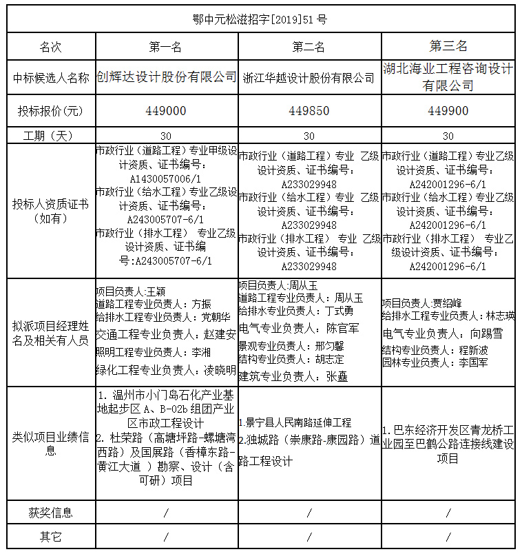 松滋市智能针纺服装产业园双裕路(西望路-白云边大道)道路工程设计项目于2019年12月25日发出招标邀请书,2020年1月3日在中元工程咨询有限责任公司会议室开标,并于2020年1月3日完成评标工作。根据评标委员会提交的评标报告,松滋金松工业投资开发有限公司已经确认评标结果,现进行评标结果公示。